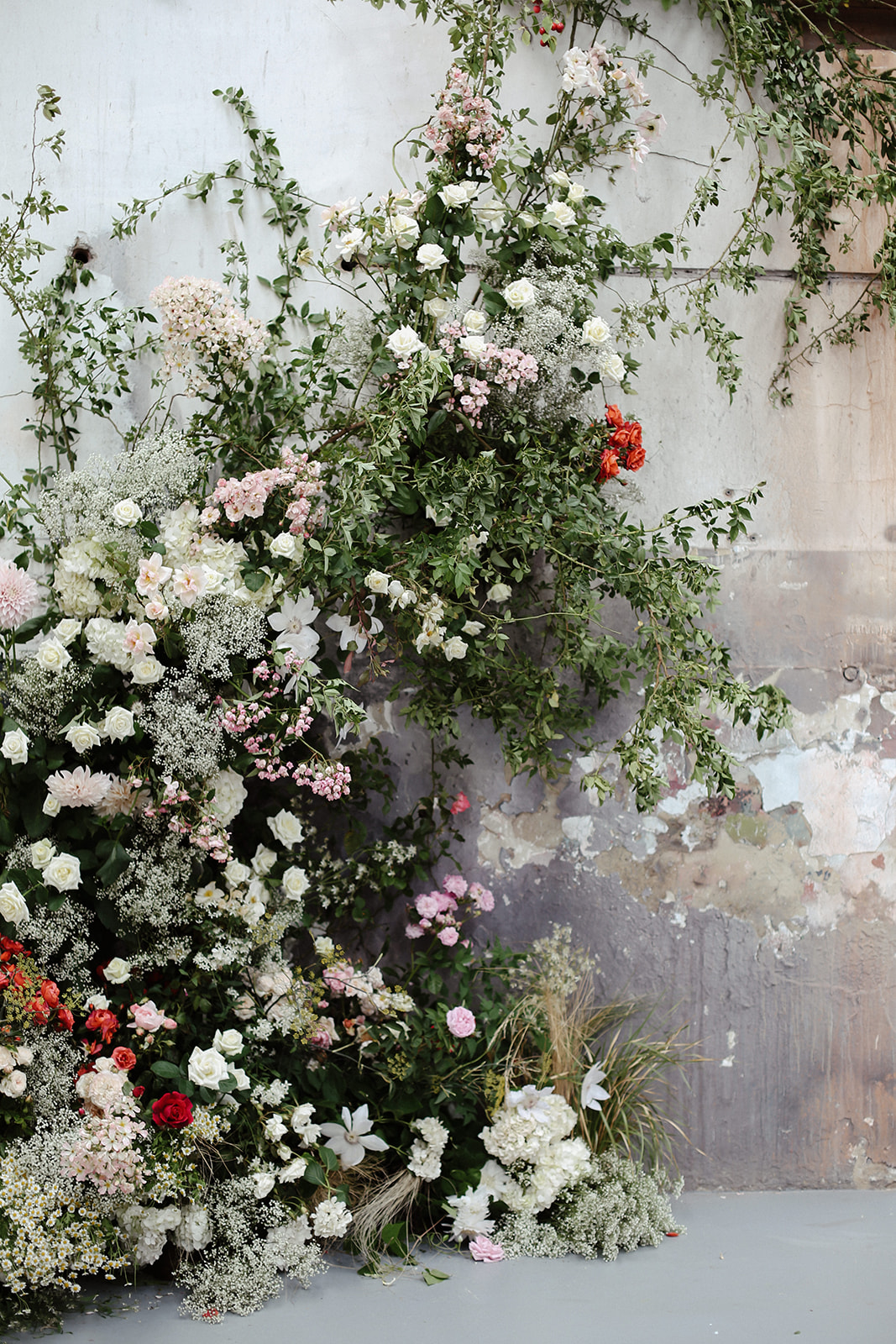 A wild and tumbling floral backdrop sits amongst the Firecracker HQ, an old panelbeaters warehouse. Considered and memorable table blooms, leaving plenty of room for the feast.